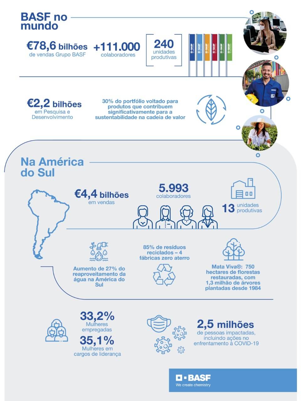 Desde o início da pandemia, a BASF forneceu produtos essenciais para os clientes e atuou em diferentes parcerias para apoiar a sociedade. As ações de engajamento social, juntas, impactaram 2,5 milhões de pessoas, sendo 2,2 milhões relacionadas a ações de combate à pandemia, como a doação de cestas básicas, álcool em gel, produtos de higiene e limpeza.