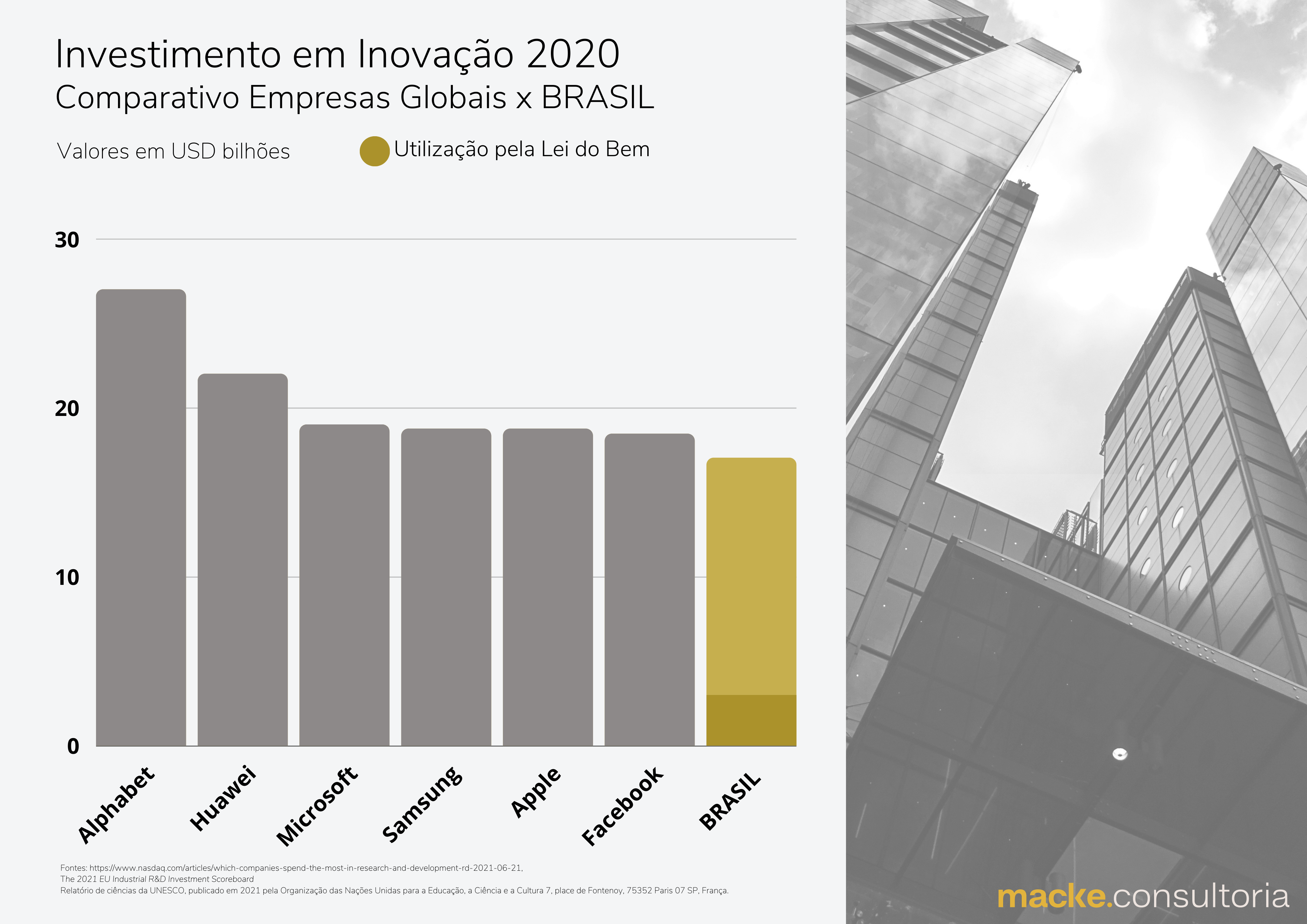 De acordo André Moro Maieski, especialista em investimentos e inovação e sócio da Macke Consultoria, o Brasil investe muito pouco em inovação quando comparado com as seis maiores empresas do ranking da EU Industrial R&D Investment Scoreboard, referente ao ano de 2020. Elas totalizaram mais de 580 bilhões de reais investidos em PD&I (Pesquisa, desenvolvimento e inovação), enquanto no Brasil inteiro, utilizando a porcentagem de 1,20% do PIB, o valor foi de aproximadamente 84 bilhões de reais. Dentro desse cenário, o principal mecanismo para incentivo em investimento em inovação no país é a Lei 11.196/05, conhecida como Lei do Bem Cap. III, que impactou mais de 2.500 empresas no ano base de 2020, aplicando 14,02 bilhões de reais e gerando até 3,87 bilhões em renúncia fiscal, segundo informações do MCTI – Ministério de Ciência Tecnologia e Inovações.