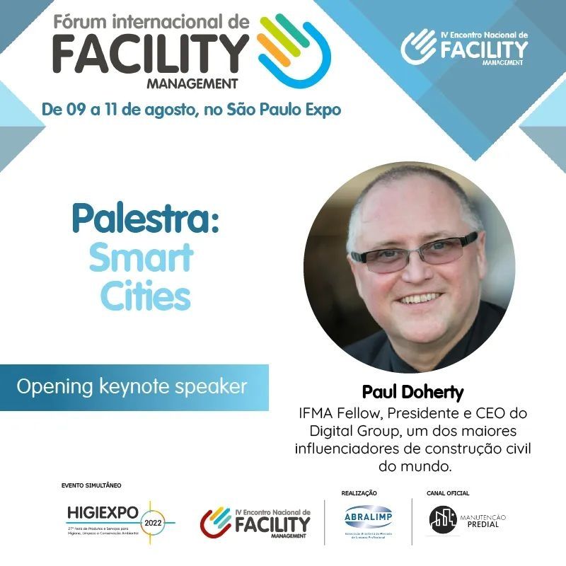 A palestra de abertura do Fórum Internacional de Facility Management, área premium do IV Encontro Nacional de Facility Management, será com um dos maiores especialistas e influenciadores do mundo em Smart Cities, Paul Doherty.