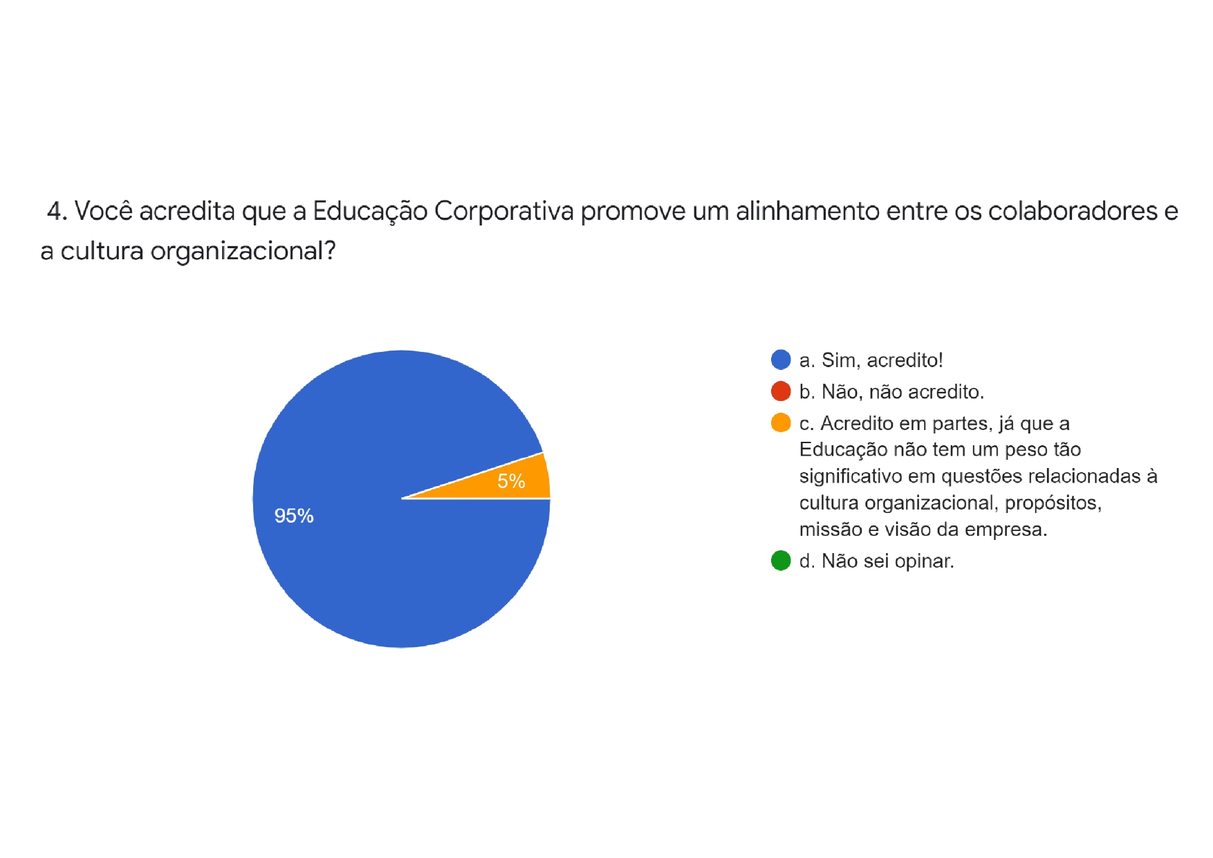 A pesquisa também mostra que 95% dos entrevistados creem que a educação corporativa promove um alinhamento entre os colaboradores e a cultura organizacional. Apesar disso, quando questionados a respeito da porcentagem dos investimentos destinados ao gênero em relação ao faturamento, apenas 10,9% afirmaram destinar mais de 30%. Quase metade (44,5%) dos participantes confessaram que essa taxa gira em torno de 5% e 10%.