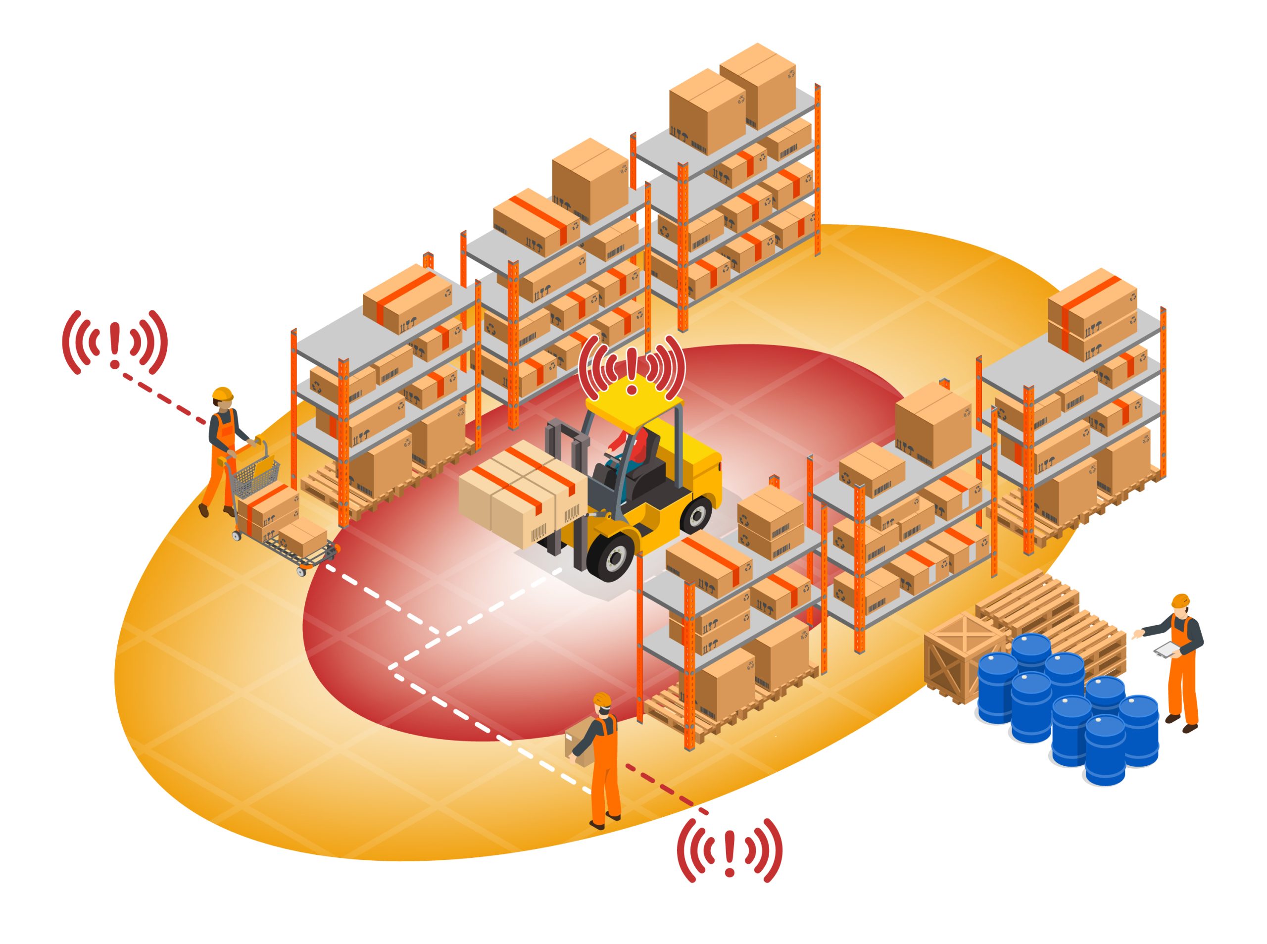 Sempre que um destes entrar no raio de detecção de sinais, o equipamento emitirá sinais sonoros, visuais e de vibração – para o pedestre e para o operador da empilhadeira – mesmo se entre eles houver pontos cegos e bloqueios físicos, como blocos de cargas, paredes, racks, contêineres.