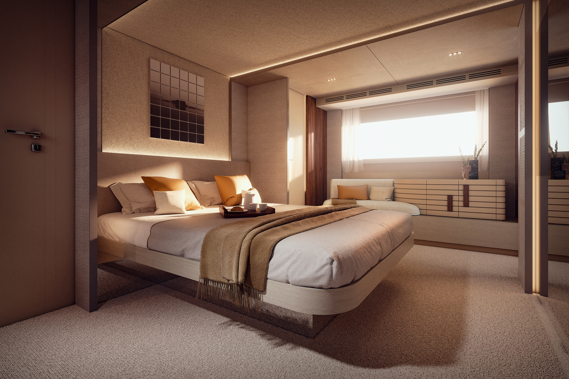 O interior do iate é projetado para oferecer o mesmo nível de conforto que uma residência de alto padrão. Com materiais nobres como linho, couro natural e mármore Rains Forest Brown, a Grande 25 Metri é uma verdadeira obra de arte. O mobiliário orgânico e flutuante contribui para a sensação de leveza e movimento nos espaços.