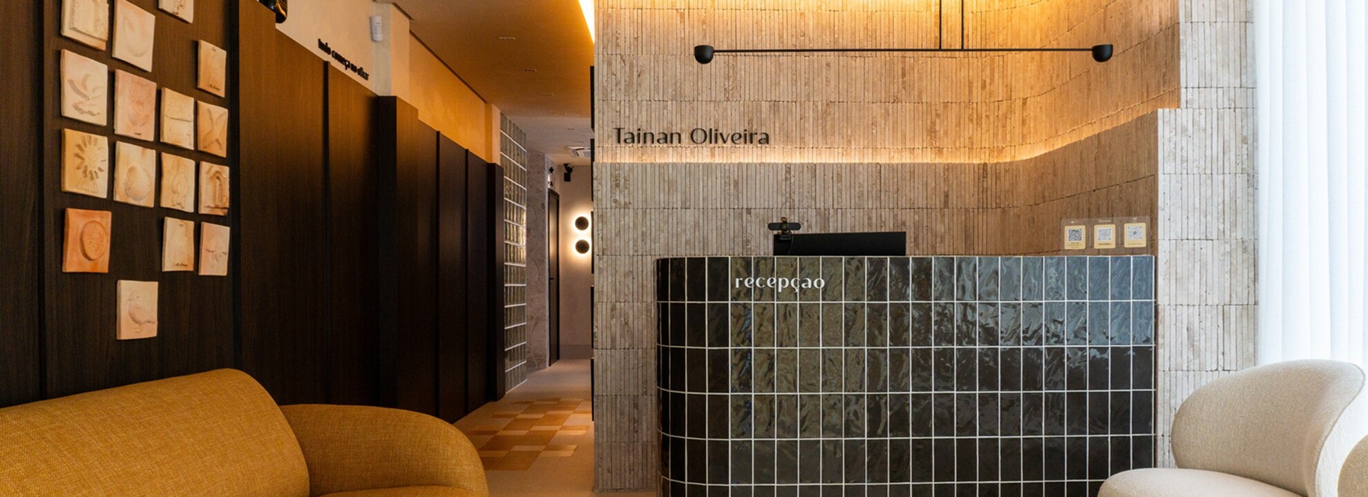 A recepção da Clínica Tainan Oliveira conta com um balcão curvo, revestido com azulejos escuros que se destacam, e uma iluminação acolhedora, formando um ponto focal convidativo. Elementos como blocos de vidro filtram a luz, garantindo privacidade sem comprometer a permeabilidade visual, uma característica essencial para um espaço de saúde.