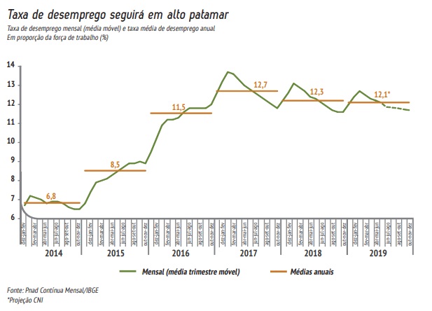 Em função do que classifica como “o marasmo que dominou a economia” ao longo de todo o primeiro semestre, a confederação estima que a taxa de desemprego continuará elevada, atingindo a 12,1% da força de trabalho. A taxa de desemprego, medida pela PNAD-Contínua Mensal do IBGE, recuou de 12,5% da força de trabalho para 12,3%, na passagem de abril para maio. Apesar dessa ter sido a segunda queda consecutiva do indicador, a entidade considera que a lentidão com que o mercado de trabalho vem reagindo à crise é um “reflexo do baixo dinamismo da economia brasileira”. Consequentemente, o crescimento do rendimento médio real e da massa salarial real desacelerou nos primeiros cinco meses do ano, na comparação com igual período do ano passado.