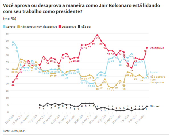Com a crise de saúde pública em Manaus e desencontros sobre o cronograma de vacinação, a aprovação à gestão do presidente Jair Bolsonaro caiu de 37% para 26%, a maior queda semanal desde o início de seu governo. Agora, está no mesmo nível de junho de 2020, um dos momentos mais críticos da pandemia. A queda acentuada fez com que a desaprovação ao governo saltasse para 45%.