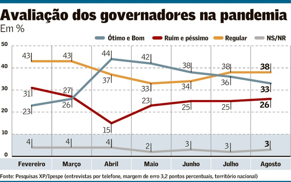 Em fevereiro, quando o coronavírus ainda não era uma realidade para os brasileiros, os governadores eram avaliados como ótimos e bons por 23% da população, de acordo com pesquisa XP/Ipespe. Dois meses depois, a popularidade já era de 44%. Na última sondagem, de agosto, era de 33%.