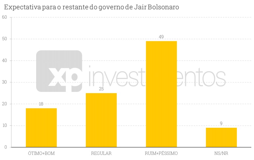 A primeira pergunta foi a avaliação do governo do presidente Jair Bolsonaro, comparável com o histórico da pesquisa XP/Ipespe. A aprovação (ótimo+bom) foi de 31% e a desaprovação (ruim+péssimo), de 42%. Ainda, 24% dos entrevistados avaliaram o governo de forma regular e 3% disseram não saber ou não responderam.