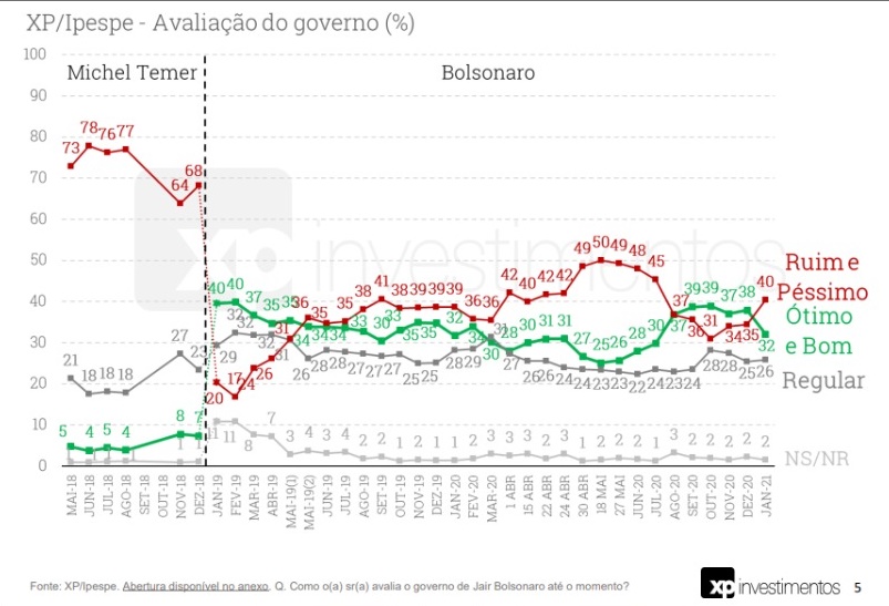 A rodada de janeiro da pesquisa XP/Ipespe mostra que subiu de 35% para 40% a parcela da população que considera ruim ou péssimo o governo de Jair Bolsonaro, percentual semelhante ao do início da pandemia de coronavírus, em abril de 2020.
